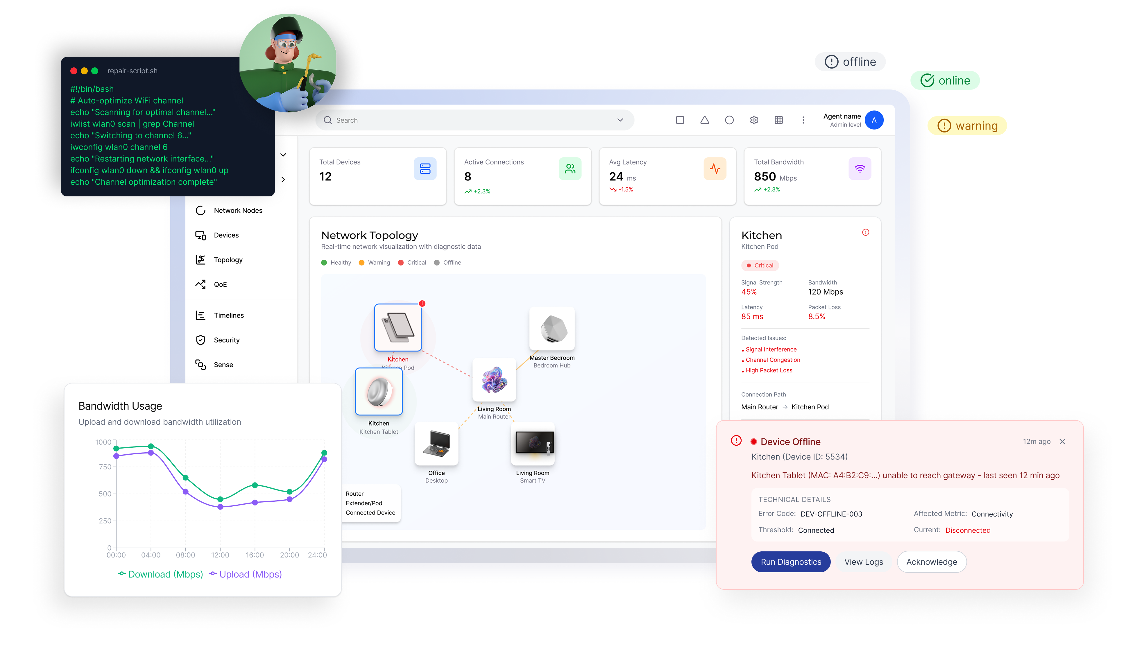 Designed the operational visualization system for Righ (acquired by Plume Design), enabling support agents to diagnose network health instantly through role-based tiered dashboards.